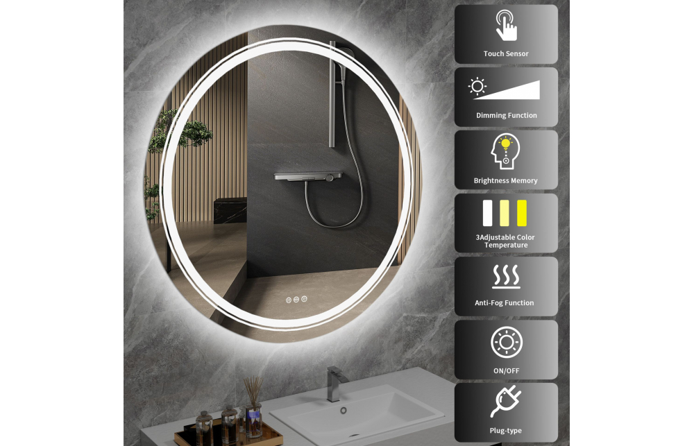 настенное зеркало для ванной комнаты, Размеры: 60/60/4,5 см / светодиодная подсветка / функция запоминания программ / функция защиты от запотевания, регулировка яркости / холодный или теплый свет / сенсорный выключатель, материал: основа - алюминиевая пластина и рама / зеркало, цвет: серебристый