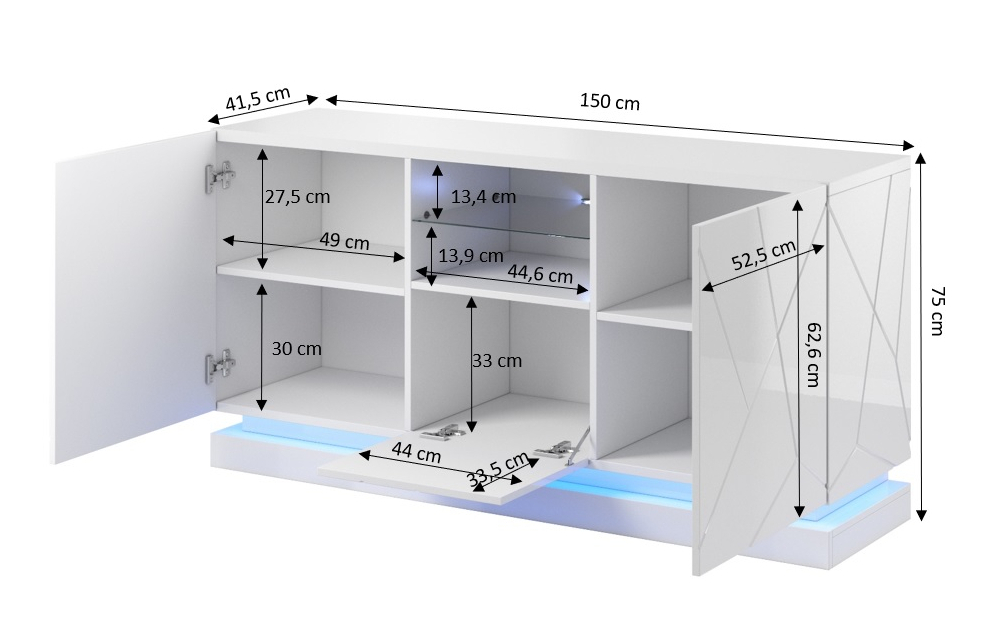 Размеры: h/w/d- 75cm/150cm/41,5cm материал Боковины и фасады: глянцевая ламинированная плита МДФ с видимыми фрезами Столешница: глянцевая ламинированная плита МДФ Ножки: цоколь Ручки: фасады выступают над столешницей Подсветка: синяя или RGB, предназначенная для комода QIU, заказывается отдельно Размеры упаковки: ящик 1/2: 154x44x10; вес 25,5 кг ящик 2/2: 66,5x57x21; вес 29 кг