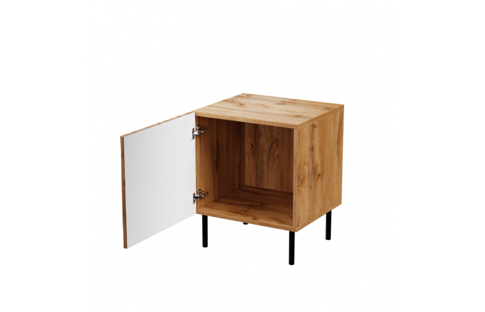 Размеры: в/ш/г 53,5см/44см/40,5см, материал: Корпус: матовая ламинированная ДСП 16 мм Фасад: Ламинированная МДФ плита, облицованная пленкой 18 мм, с видимыми фрезами Кромки: дуб вотан - PCV Ножки: металл Ручка: отсутствие. система PUSH - CLICK размер упаковки: коробка: 58x44,5x19 вес 21 кг