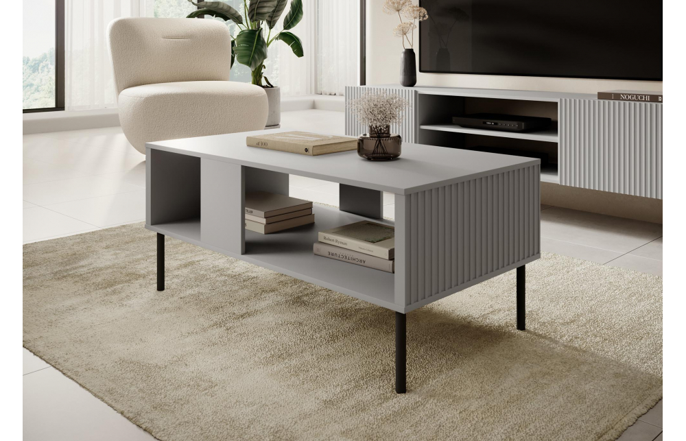 kohvilaud, mõõdud: 110/60/48 cm, materjal: laminaatlaastplaat / lamineeritud MDF / jalad - metall, värv: raam - helehall, jalad - must