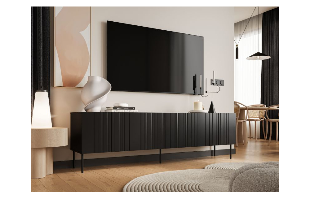Подставка под телевизор ISLA 200 черный мат Размеры: в/ш/г - 60см/200,5см/40см материал: корпус: ламинированная ДСП 16 мм Фасады: фрезерованная плита МДФ 16 мм Ножки: черный металл, высота 20 см Ручка: система PUSH TO OPEN