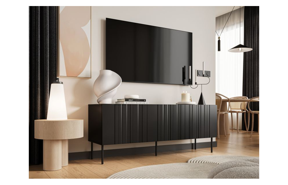 Подставка под телевизор ISLA 150 черный мат Размеры: h/w/d - 60см/150,5см/40см материал: корпус: ламинированная ДСП 16 мм фасады: фрезерованная МДФ плита 16 мм ножки: черный металл, высота 20 см ручка: система PUSH TO OPEN