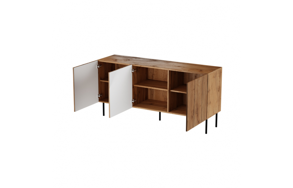 Размеры: в/ш/г 74,5см/152см/42см, материал: Корпус: матовая ламинированная ДСП 16 мм Фасад: Ламинированная МДФ плита, облицованная пленкой 18 мм, с видимыми фрезами Кромки: дуб вотан - PCV Ножки: металл Ручка: отсутствие. система PUSH - CLICK размер упаковки: коробка № 1: 182x46x9,6 вес 32,5 кг коробка № 2: 61x56x9 вес 11,5 кг