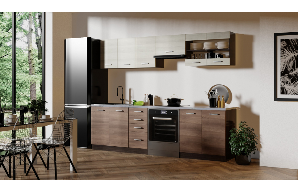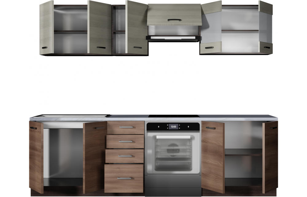 длина комплекта-260 см, толщина столешницы-28 мм, газлифт, цвета: фасад: акация чинамоне / дуб навара, корпус: венге, столешница: гранит светлый