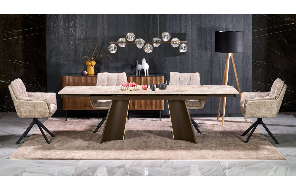 Размеры: 180-260/90/76 см, приставной стол, материал: керамика / стекло / сталь с порошковым покрытием / массив дерева, цвет: столешница - бежевый мрамор, ножки - коричневый