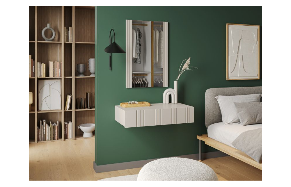 Туалетный столик ISLA бежевый матовый Размеры: h/w/d - зеркало: 79см/53см; стол: 10см/71см/28,5см материал: корпус: ламинированная ДСП 16 мм Фасады: фрезерованная плита МДФ 16 мм Ручка: система PUSH TO OPEN