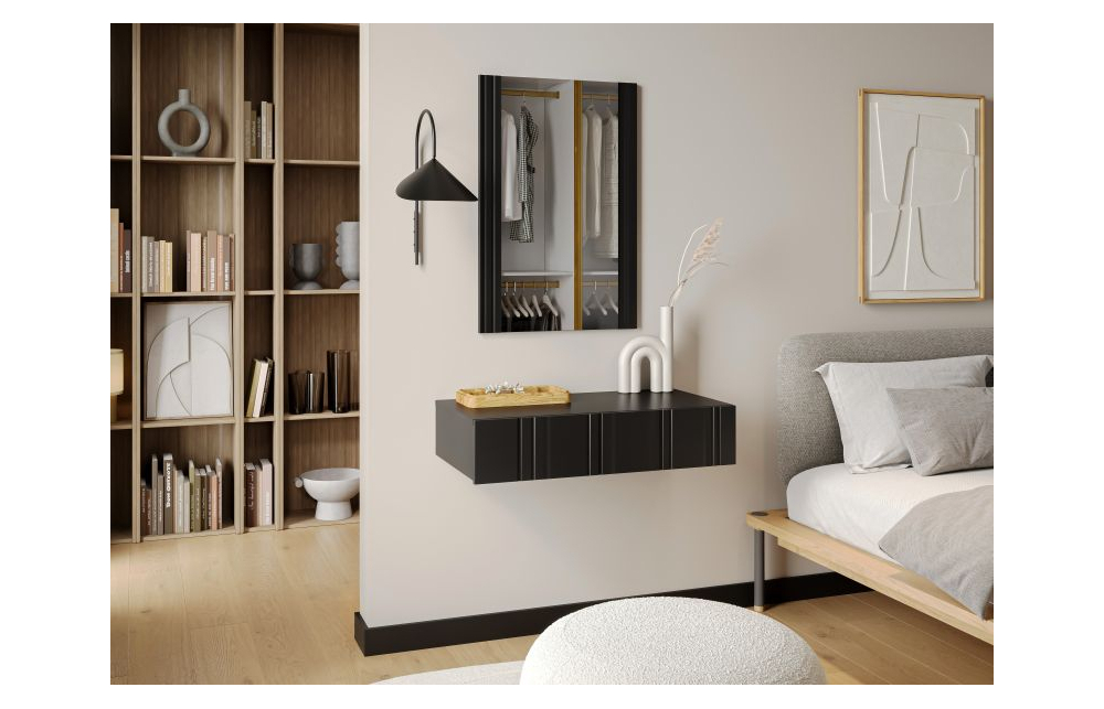 Туалетный столик ISLA черный матовый Размеры: h/w/d - зеркало: 79см/53см; стол: 10см/71см/28,5см материал: корпус: ламинированная ДСП 16 мм Фасады: фрезерованная плита МДФ 16 мм Ручка: система PUSH TO OPEN