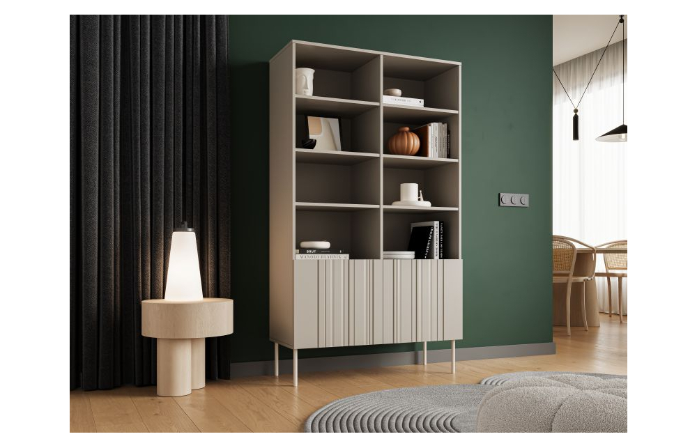 Книжный шкаф ISLA 100 бежевый матовый Размеры: в/ш/г - 174,5см/100см/40см материал: корпус: ламинированная ДСП 16 мм Фасады: фрезерованная плита МДФ 16 мм Ножки: бежевый металл, высота 20 см Ручка: система PUSH TO OPEN