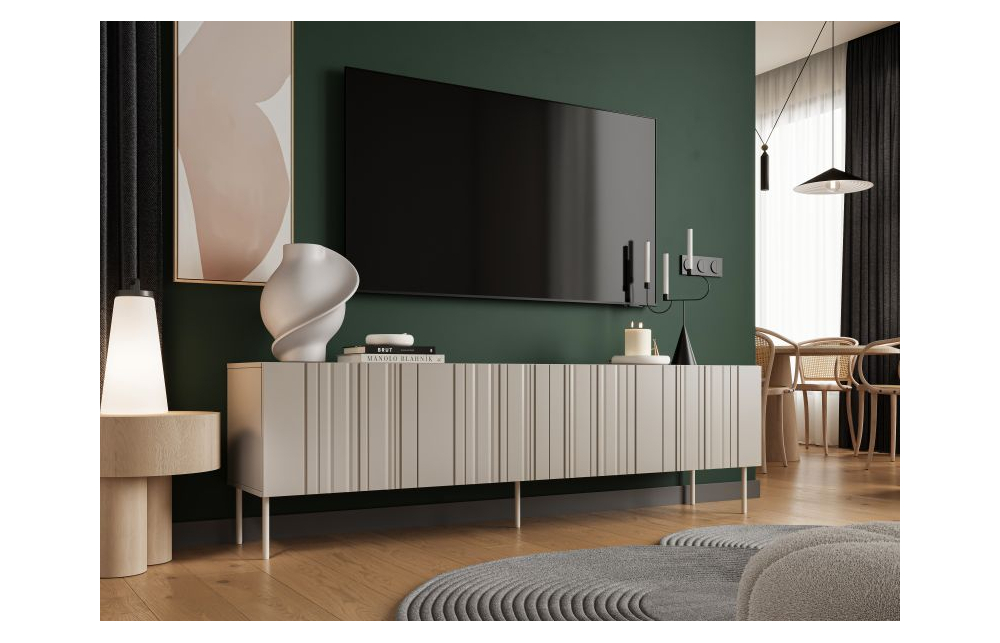 Подставка под телевизор ISLA 200 бежевый мат Размеры: в/ш/г - 60см/200,5см/40см материал: корпус: ламинированная ДСП 16 мм Фасады: фрезерованная плита МДФ 16 мм Ножки: бежевый металл, высота 20 см Ручка: система PUSH TO OPEN